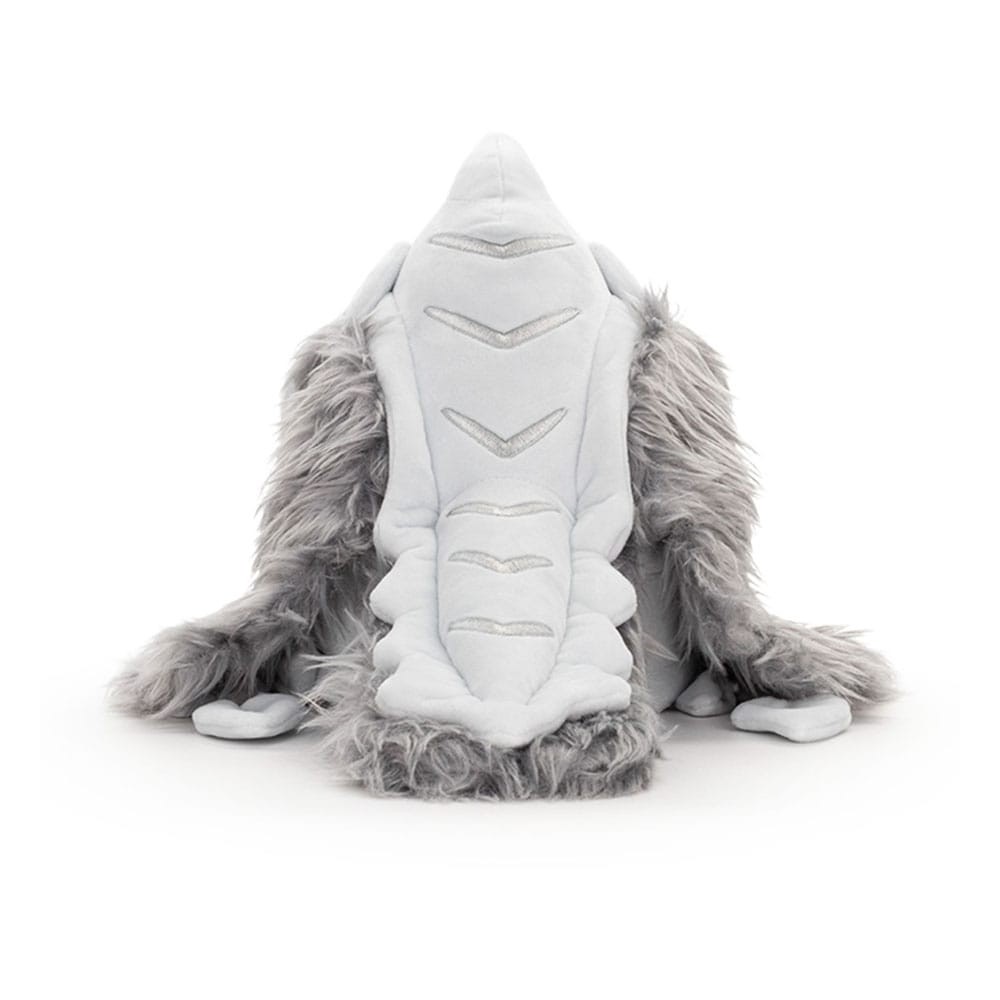 Taking down Arkveld is no easy task! Unless they're a plush of course... but would you really want to hunt them then? Hunching forward to stand at 9 inches tall as they're propped up on all four legs, their body is tones of white and grey with dark grey horns that extend forward from his head. With a menacing smile under pale purple eyes, their thick fluffy wings match a hanging beard along with the fur along its tail. This plush is packed to the seams with 100% PP cotton and is made of normal, sublimated and long pile minky materials, perfect for cuddling or flying around with!