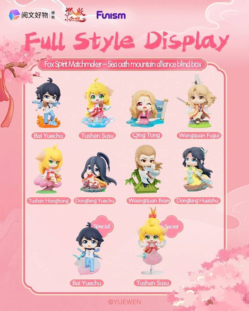 This display comes with 8 collectible figures from 'Fox Spirit Matchmaker'. The figures are approx. 8-14 cm tall and are packaged in blind bags. There are 8 characters and 2 secret figures to collect.
